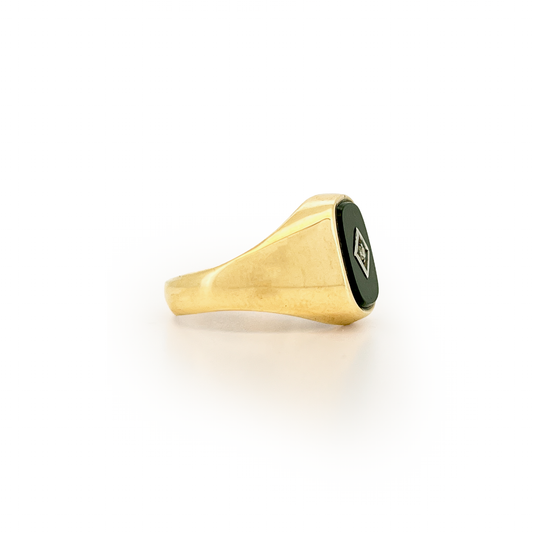 Vintage Onyx + Diamond + 9ct Yellow Gold Signet Ring - Sz. 7.75