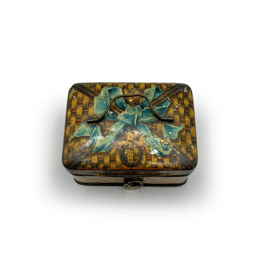 Vintage Tin Box w/ Trompe l'oeil Ribbon + Basket