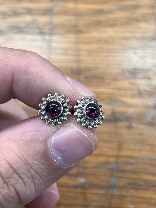 Estate Garnet Cabochon + Sterling Silver Stud Earrings