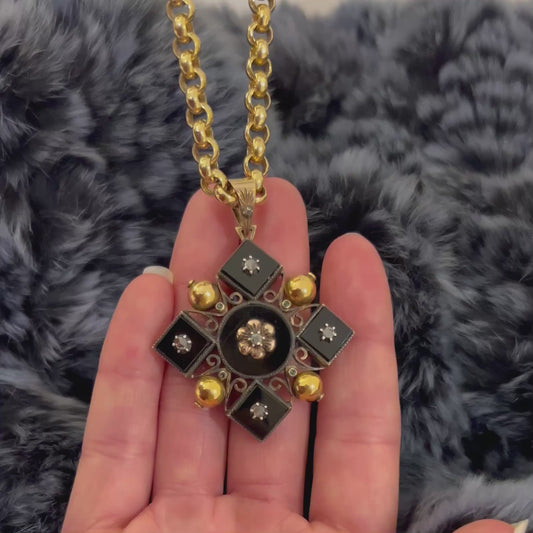 Antique Louis V Onyx + Diamond + Emerald Pendant + 19ct Yellow Gold