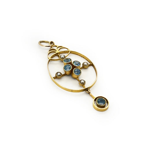 Antique Victorian Cornflower Blue Sapphire + Pearl + 15ct Yellow Gold Pendant