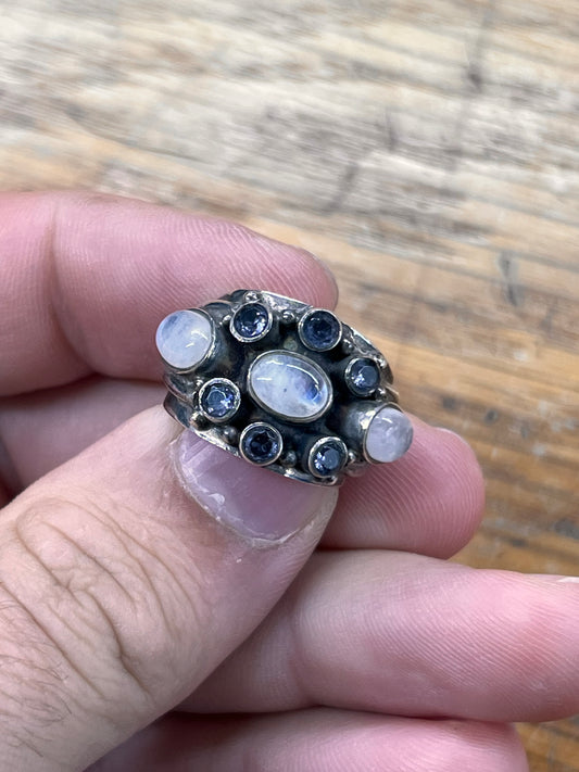 Estate Moonstone + Blue Spinel + Sterling Silver Sheild Ring - Sz. 6