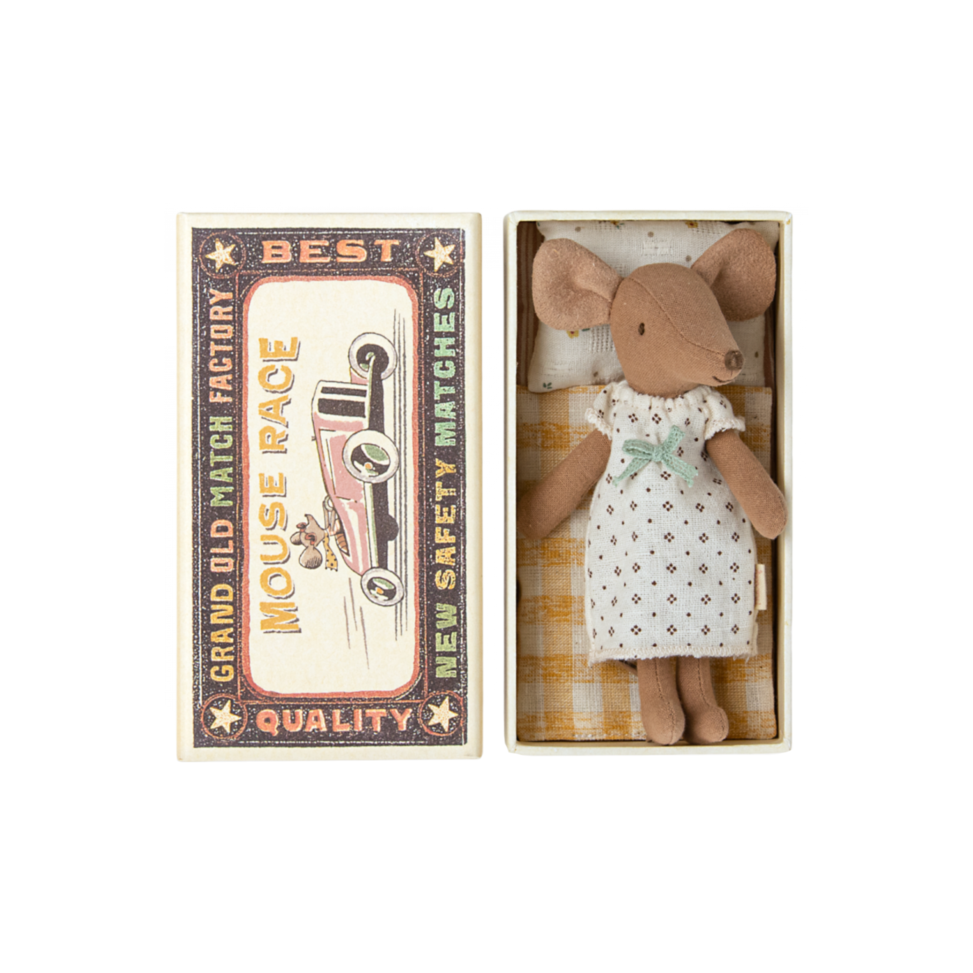 A classic Maileg item. This mouse is ready for hours of play and sleeps tight in the matchbox. The clothes and bed linen come in unique prints and beautiful colours.
