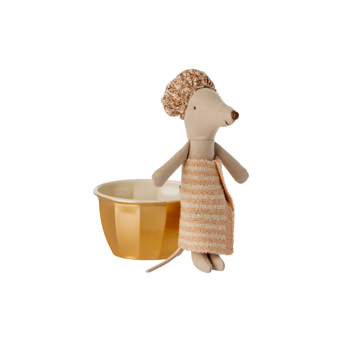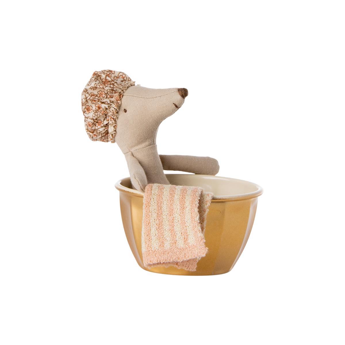 This playset contains a golden metal bathtub, a big sister mouse, a showercap and a towel.