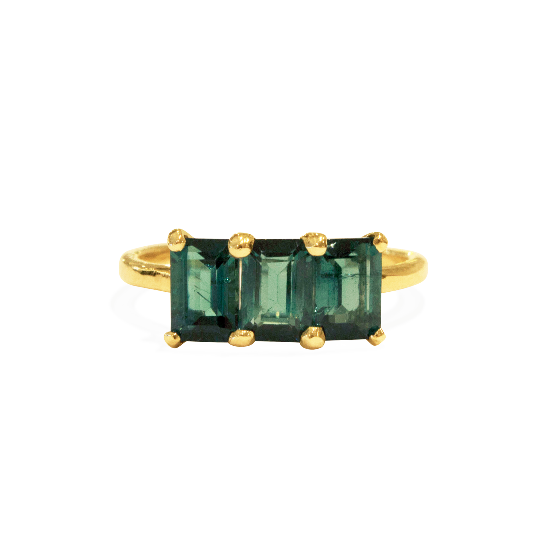 This beautiful 3 stone ring is an instant classic. The three regal blue-green tourmalines in this ring are beyond lovely. A solid ring that exudes confidence, since green tourmalines have been known to stimulate happiness and joy for life.
