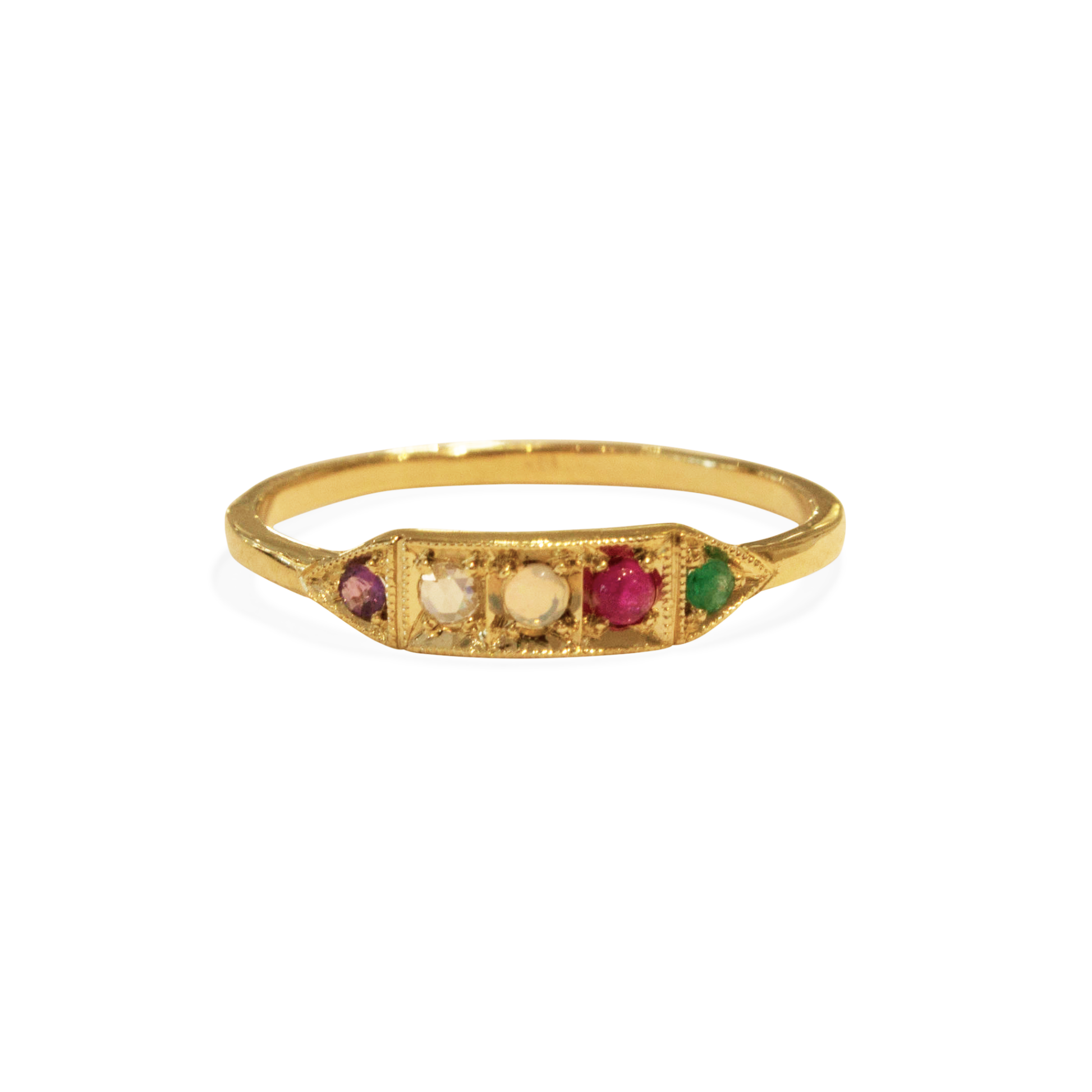 This is Ms. Goodbar, a little like a Mr. Goodbar candy bar in that it's delicious! This series of acrostic rings are extra special as this ring spells out ADORE (Amethyst, Diamond, Opal, Ruby and Emerald). Acrostic jewelry was very popular in the 1800s. Using the first letter of each gemstone to spell out a word, these pieces are very special like sending a secret message to the wearer or recipient.