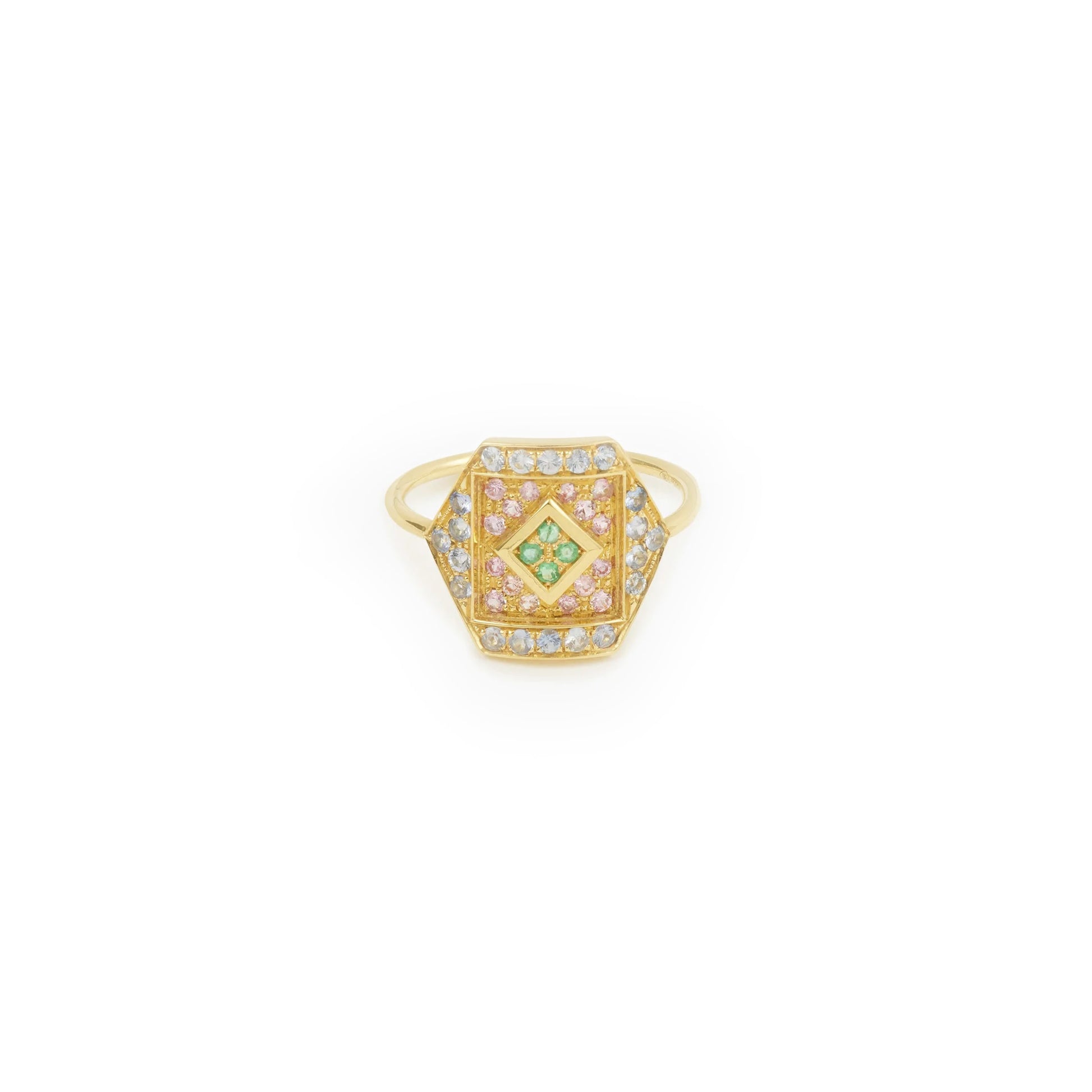Handmade in 18 carat recycled yellow gold and set with 40 precious stones : 20 light blue sapphires, 16 pink sapphires and 4 emeralds. The central form elegantly fits the shape of your finger.