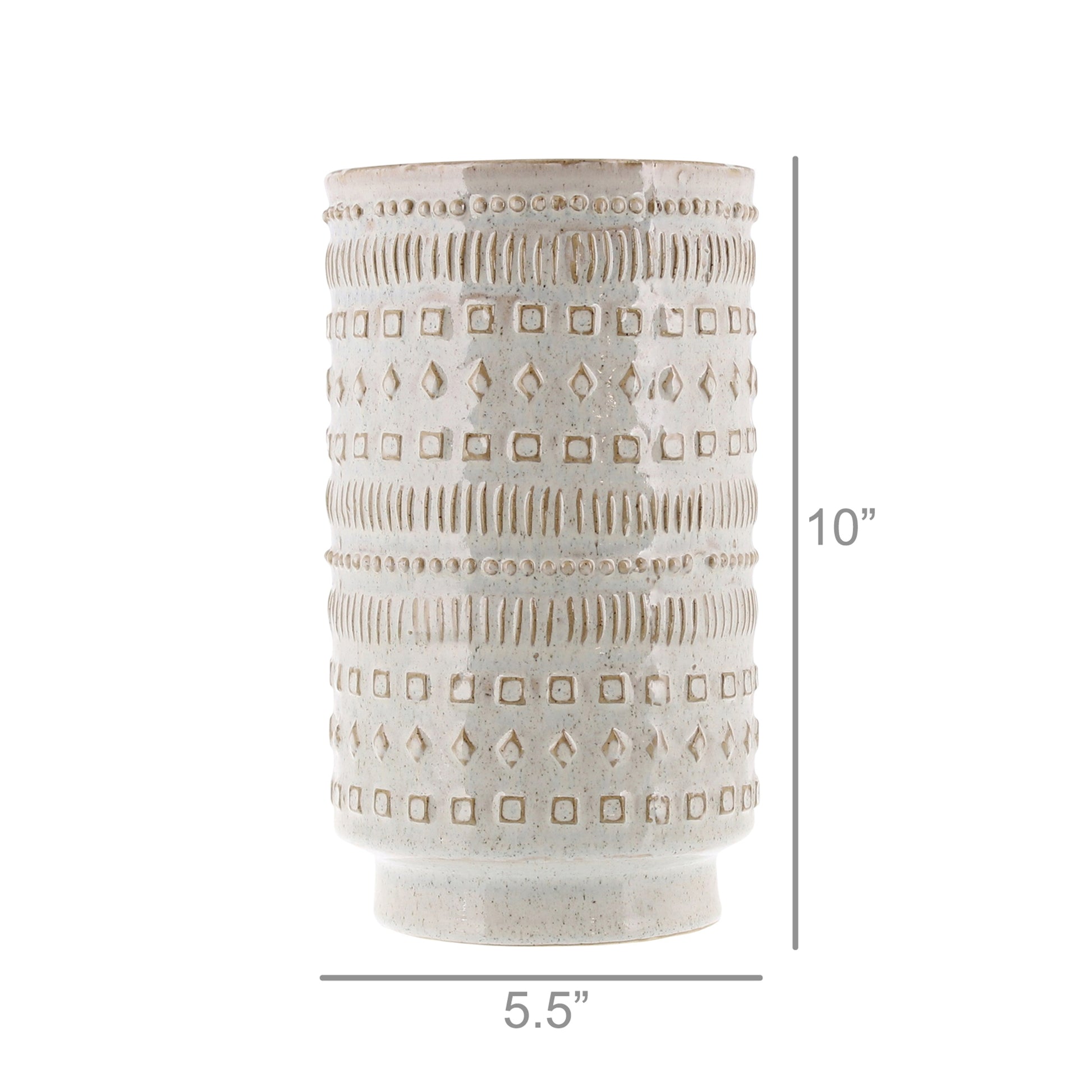 The undulating embossed patterns of this ceramic vase is reminiscent of South American craft and the creamy white glaze adds just the right amount of sheen to bring the pattern to life.