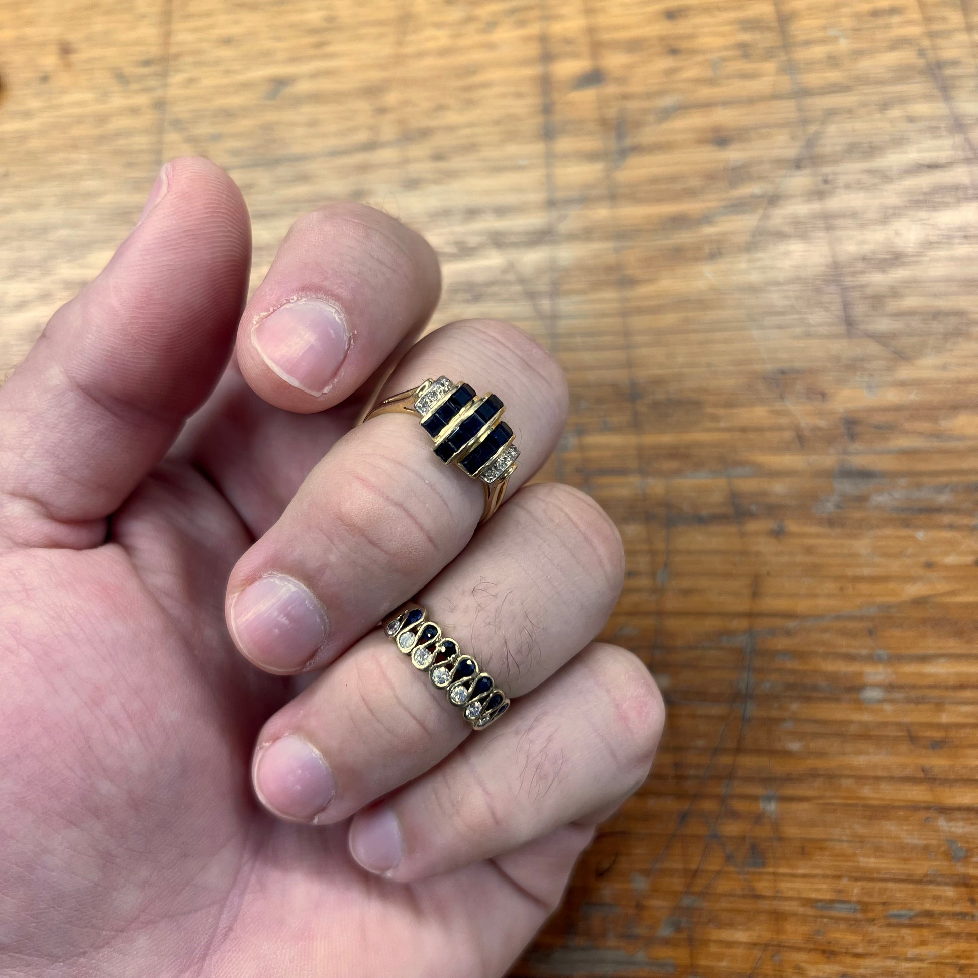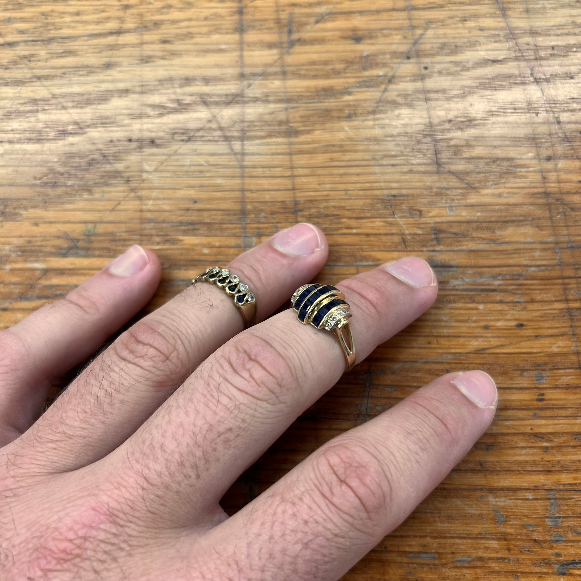 Vintage Blue Sapphire + Diamond + 14ct Yellow Gold Tank Ring - Sz. 8